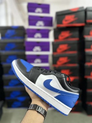 Step into timeless style with the Jordan 1 Low Alternate Royal Toe sneakers. Featuring a classic low-top silhouette, these shoes boast premium leather construction in a striking combination of royal blue, black, and white.